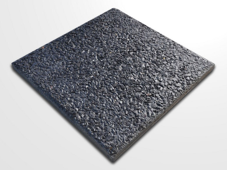 Baldosa Prensada Piedra Lavada Negra sobre fondo gris, apta para Espacios de Alto Transito. Medida 40x40 cms, espesor 2,8cms.